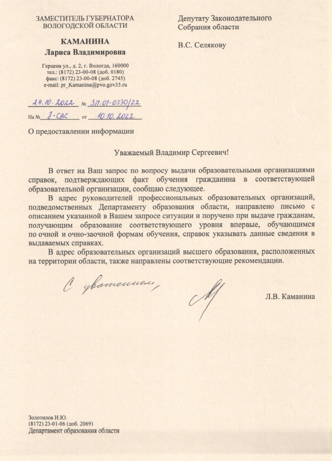 "В понедельник я получил ответ от Ларисы Каманиной. Она сообщила, что разъяснения о правильном оформлении справок для военкоматов донесены до всех учебных заведений региона. Наши предложения были учтены. Данное изменение поможет многим вологжанам избежать лишней нервотрепки для получения законной отсрочки", - заявил координатор Вологодского регионального отделения ЛДПР Владимир Селяков.