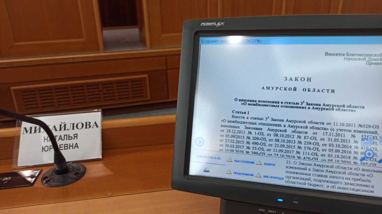 Немаловажным вопросом очередного заседания Заксобрания стал проект закона Амурской области «О межбюджетных отношениях в Амурской области». Инициатором данного законопроекта выступила Благовещенская городская Дума, которая предложила оставлять в бюджетах городских округов не 15, а 30 % налога, взимаемого в связи с применением упрощённой системы налогообложения
