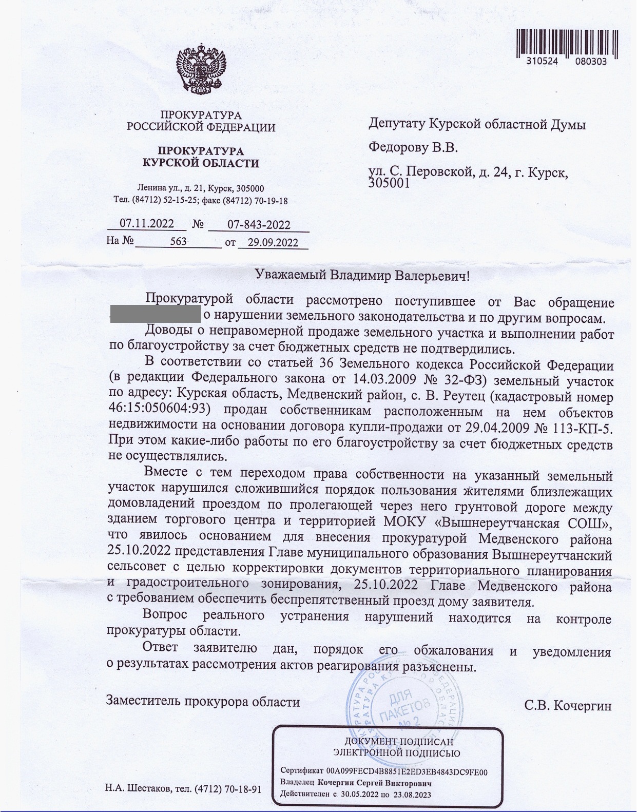 Депутат Курской областной Думы Владимир Федоров на основании данного обращения направил депутатский запрос в прокуратуру.