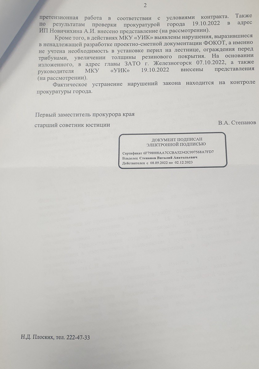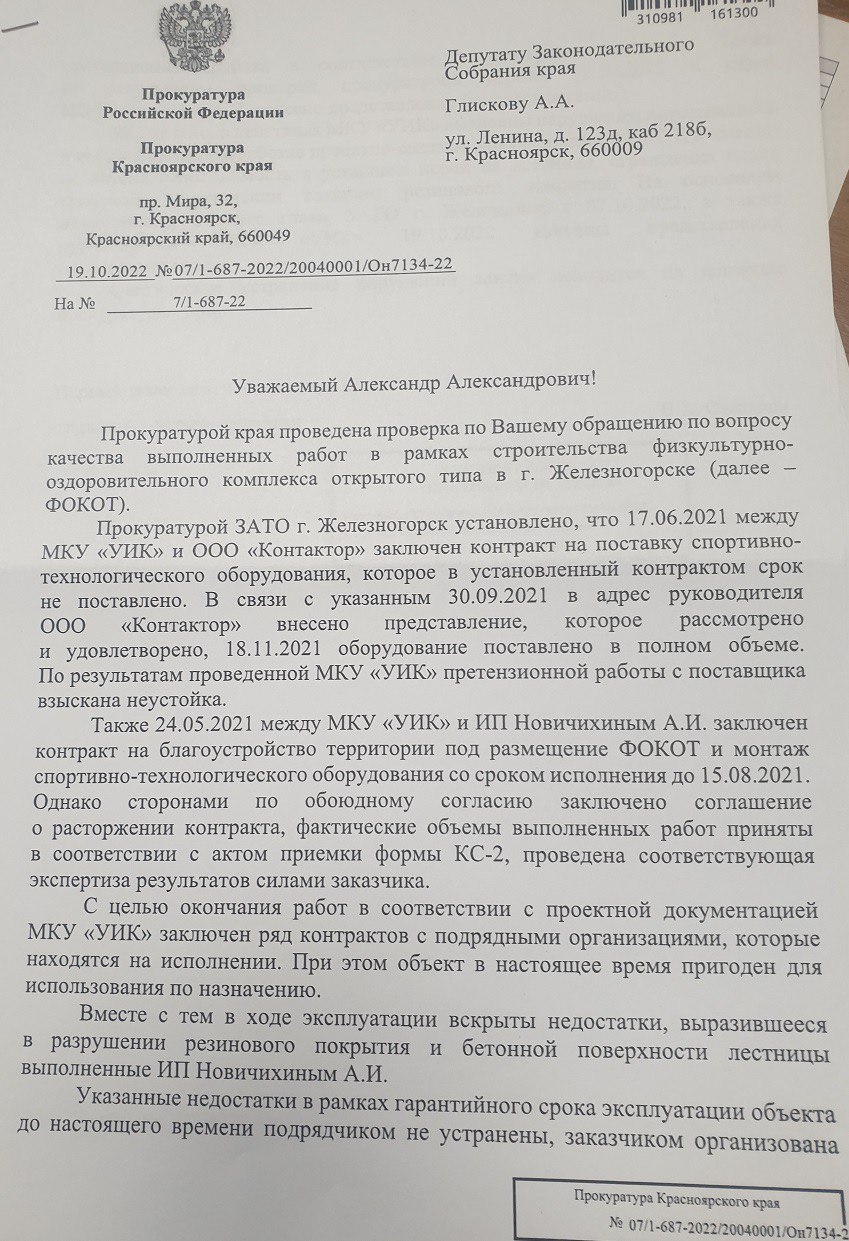 Что не так со спортивной площадкой в Железногорске? Депутат ЛДПР Александр Глисков получил ответ прокуратуры на вопрос о качестве работ строительства физкультурно-оздоровительного комплекса в Железногорске