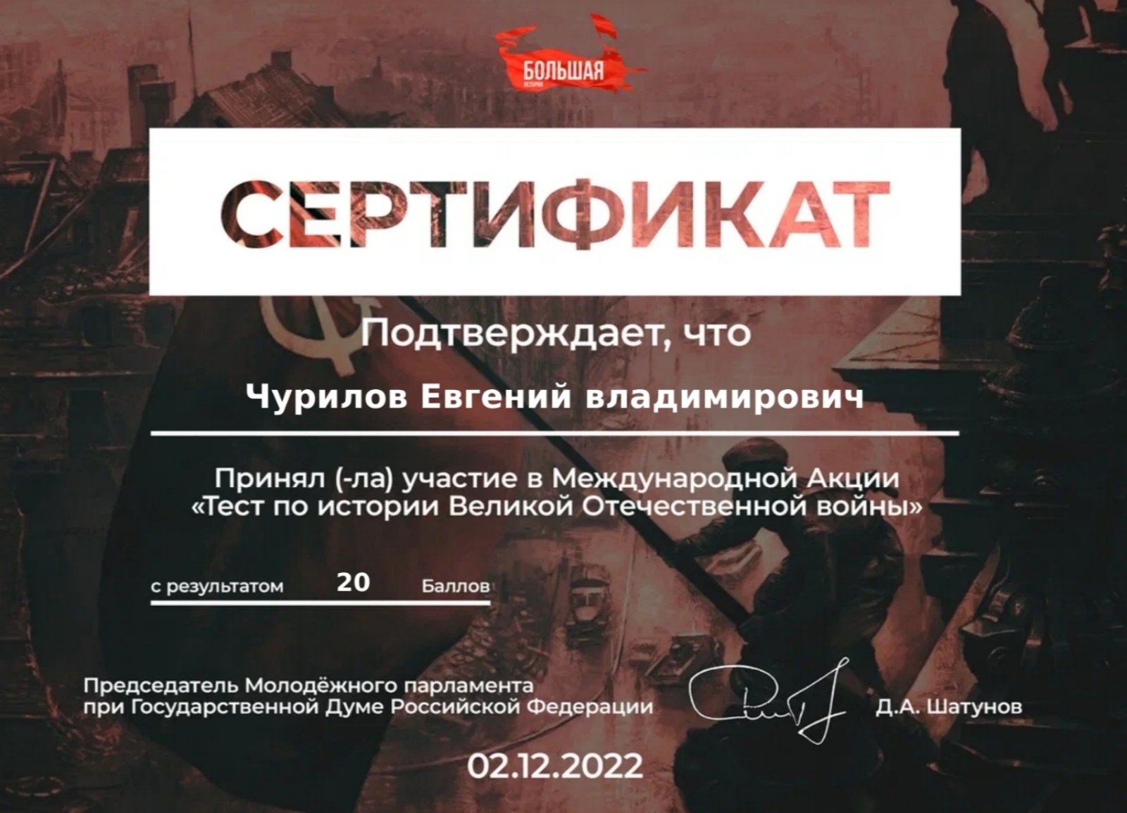 Стоит отметить, что партийцы приняли участие в тестировании знаний и дистанционно. Так координатор первичного отделения №1 в Нижневартовске Евгений Чурилов принял онлайн участие в международной акции «Тест по истории Великой Отечественной войны» и получил сертификат о прохождении теста.