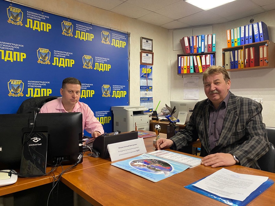 Руководитель Калининградского регионального отделения ЛДПР Евгений Мишин в штабе партии встретился с председателем правления Калининградского отделения международного общественного фонда «Российский фонд мира» Виктором Голубевым.