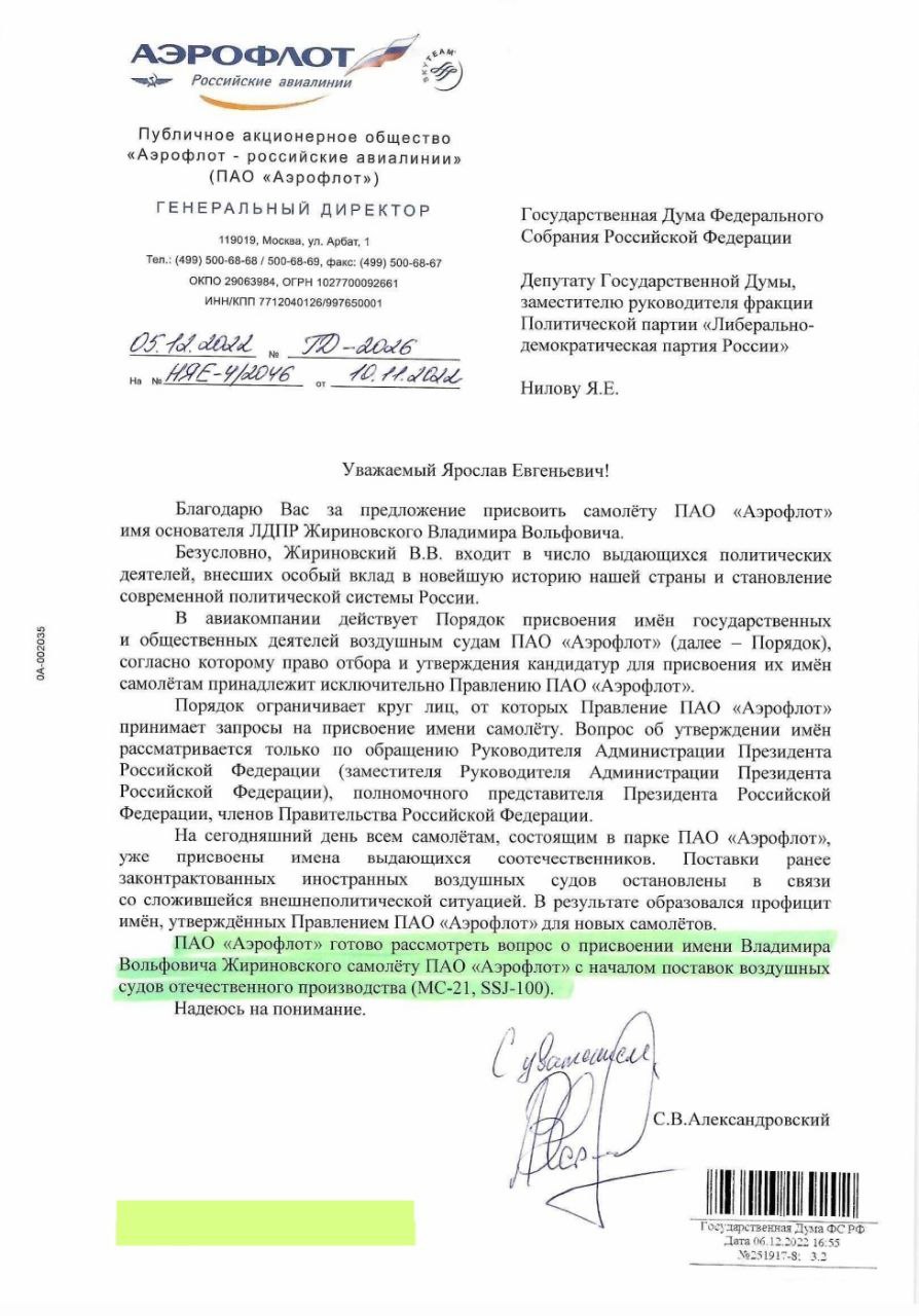 Аэрофлот пообещал рассмотреть инициативу депутата Государственной Думы Ярослава Нилова присвоить имя Владимира Жириновского одному из своих самолётов