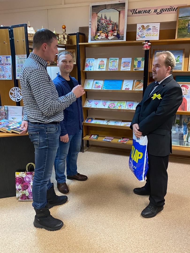 Депутаты фракции ЛДПР в Новодвинском горсовете Константин Алехинцев и Александр Иванов поздравили художника Алексея Сапунова, который открыл вторую выставку работ в Новодвинской библиотеке