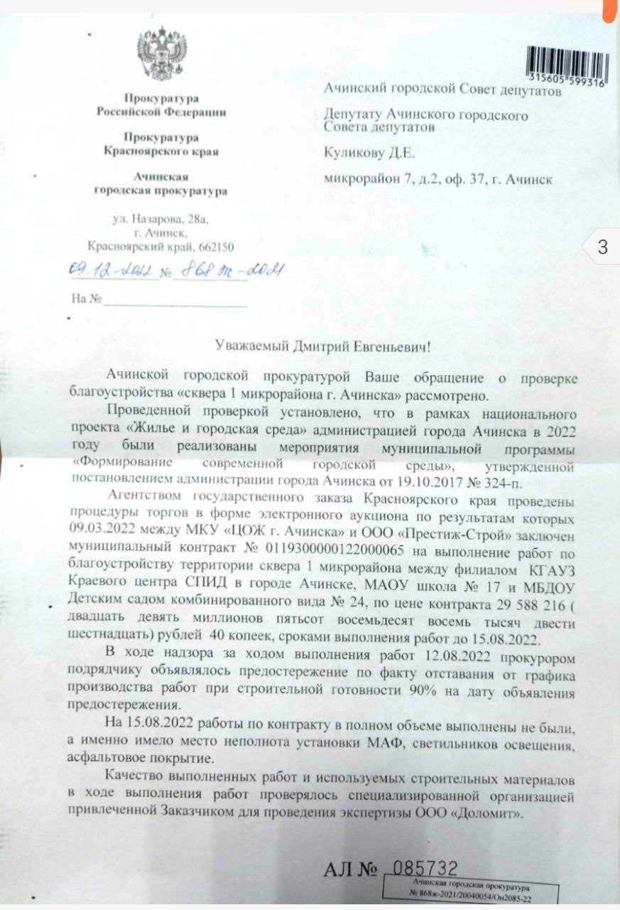 С благоустройством в Ачинске снова что-то не так. Депутат ЛДПР Ачинского городского совета Дмитрий Куликов получил ответ от прокуратуры по запросу о качестве и сроках выполнения благоустроительных работ в сквере первого микрорайона
