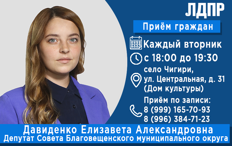 Депутат Совета Благовещенского муниципального округа от ЛДПР Елизавета Давиденко организует прием граждан по личным вопросам