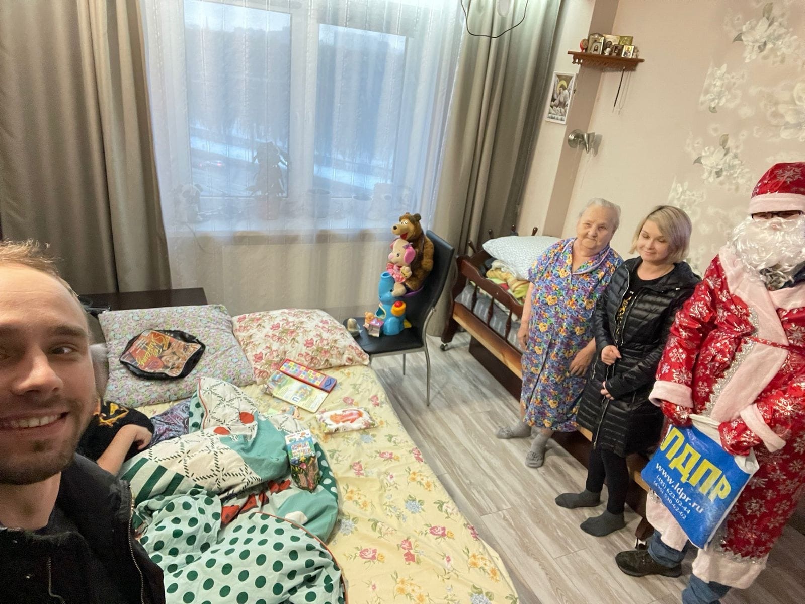 Чтобы наш Егор и его старенькая бабушка (которой уже 83 года!) не остались без подарков и приятных эмоций, к ним в гости с поздравлением пришли активисты ЛДПР Денис Меляницкий и Рифат Насыров.
