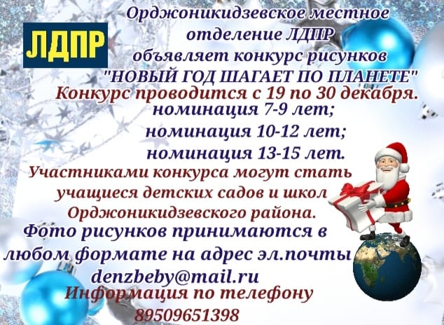 Орджоникидзевское местное отделение ЛДПР проводит конкурс рисунков “Новый год шагает по планете”. Конкурс стартовал 19 декабря и продлится до 30 декабря