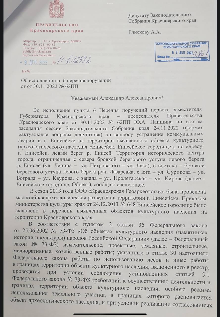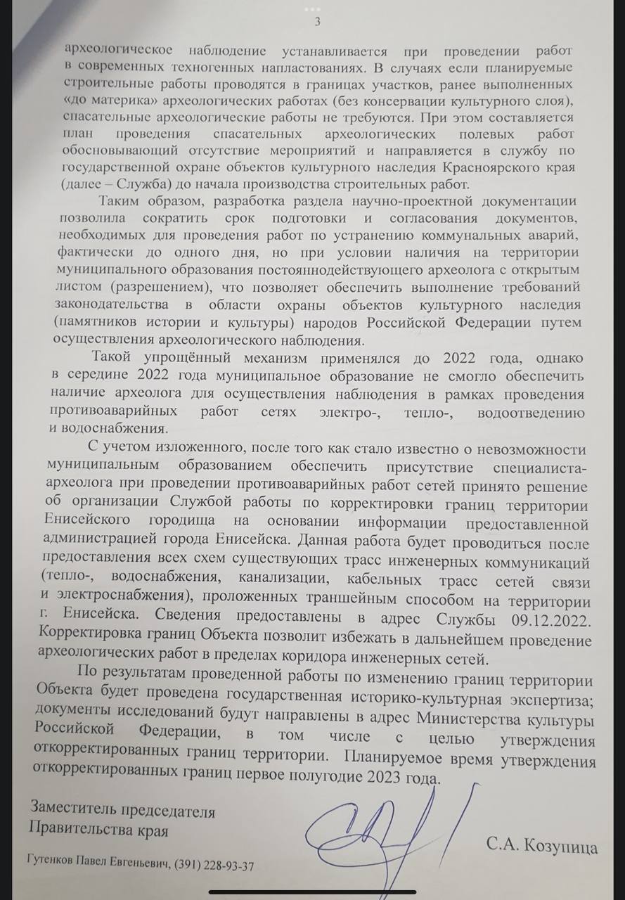 Согласно ответа правительства края, теперь будет проведена корректировка границ территории Енисейского городища. Это позволит в дальнейшем оперативно устранять аварийные ситуации на сетях тепло и водоснабжения, канализации, кабельных трассах сетей связи и электроснабжения.
