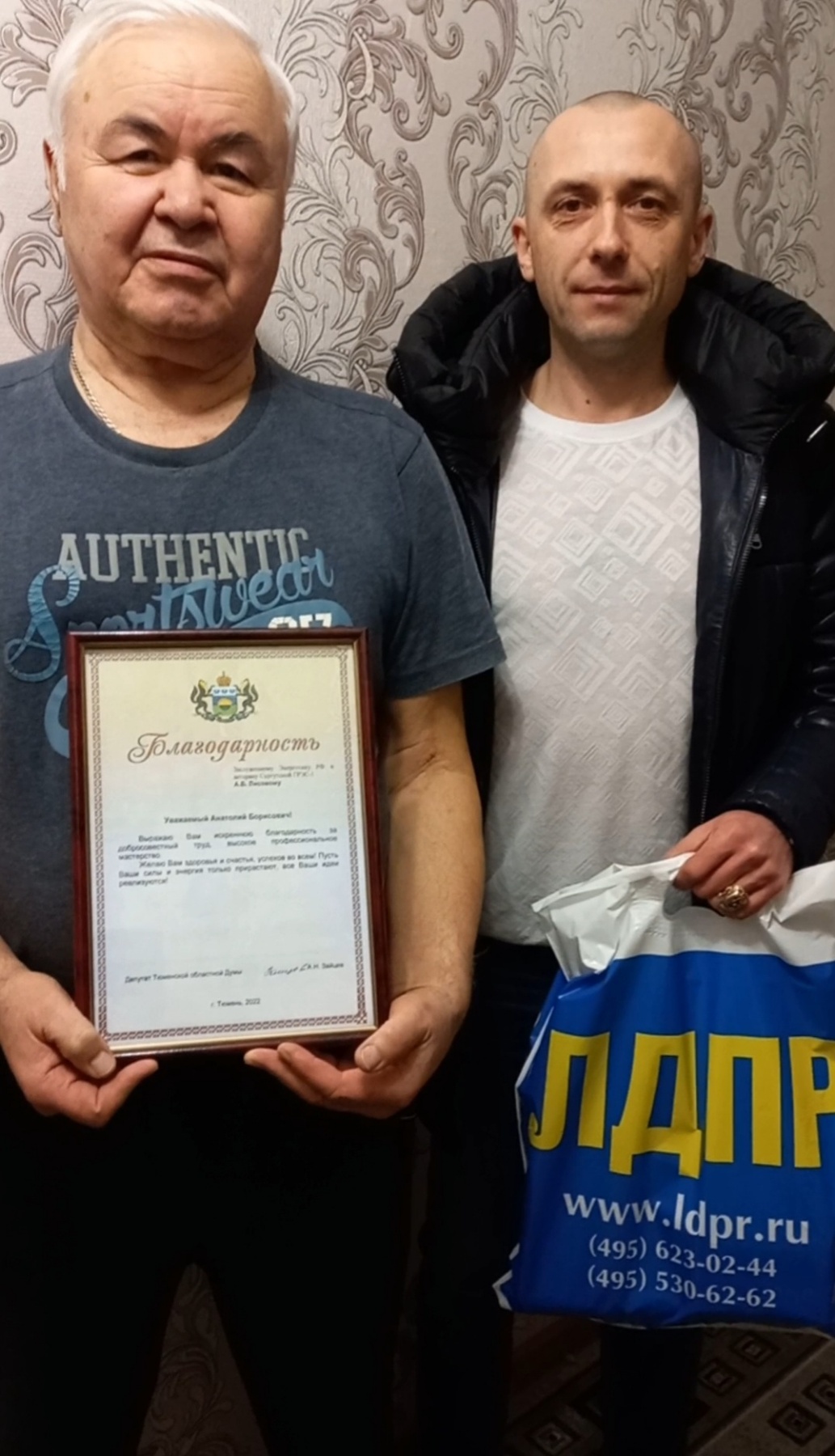 Партиец вручил благодарность за долголетний и добросовестный труд от имени депутата Тюменской областной Думы Артема Зайцева и памятные подарки с символикой ЛДПР.