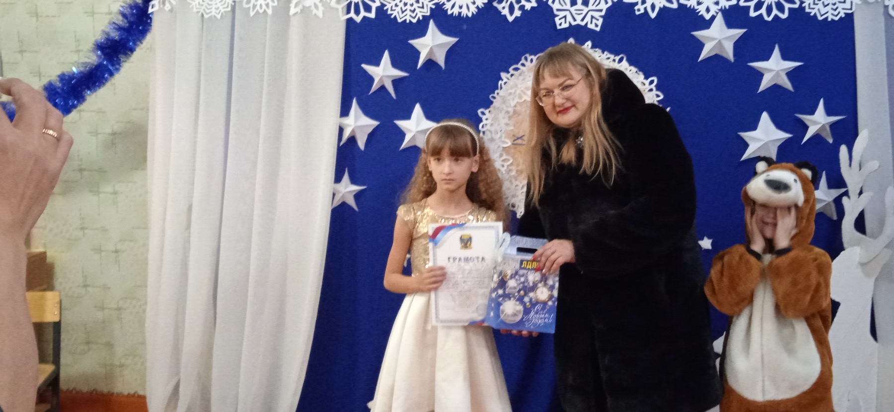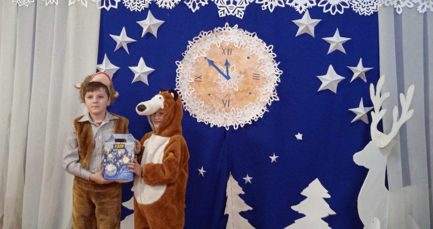 Мишка поехал к детям, чтобы доставить им новогодние подарки от ЛДПР. Помогали ему в этом координатор местного отделения ЛДПР Светлана Филиппова и активист партии Светлана Иванова.