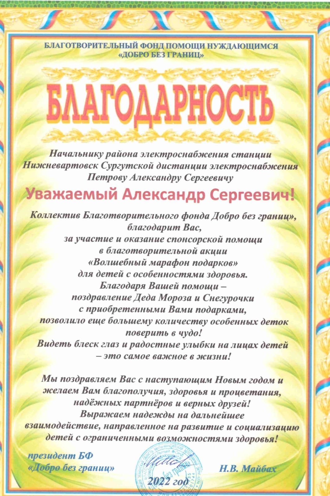 Партийного Деда Мороза Александра Петрова поблагодарили сотрудники Благотворительного фонда «Добро без границ» за неравнодушное отношение к судьбам вартовчан, за помощь и сотрудничество в благом деле!