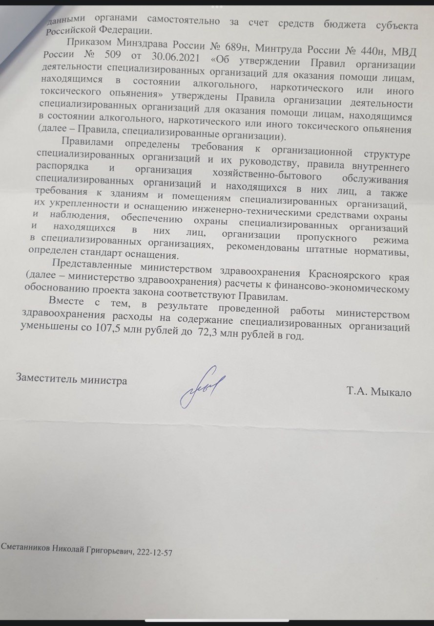Планируется создать 70 мест, на обслуживание которых изначально закладывали 107 с половиной миллионов рублей в год, то есть примерно 4200 рублей в день. Для сравнения: ночь в гостинице «Красноярск» со всеми удобствами обойдется в 3500 рублей, то есть денег у региона вполне достаточно, чтобы селить нетрезвых людей в комфортном отеле.