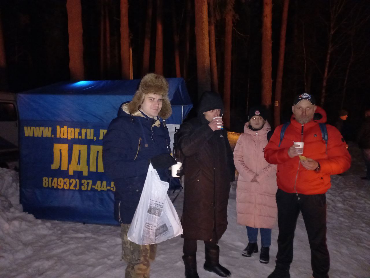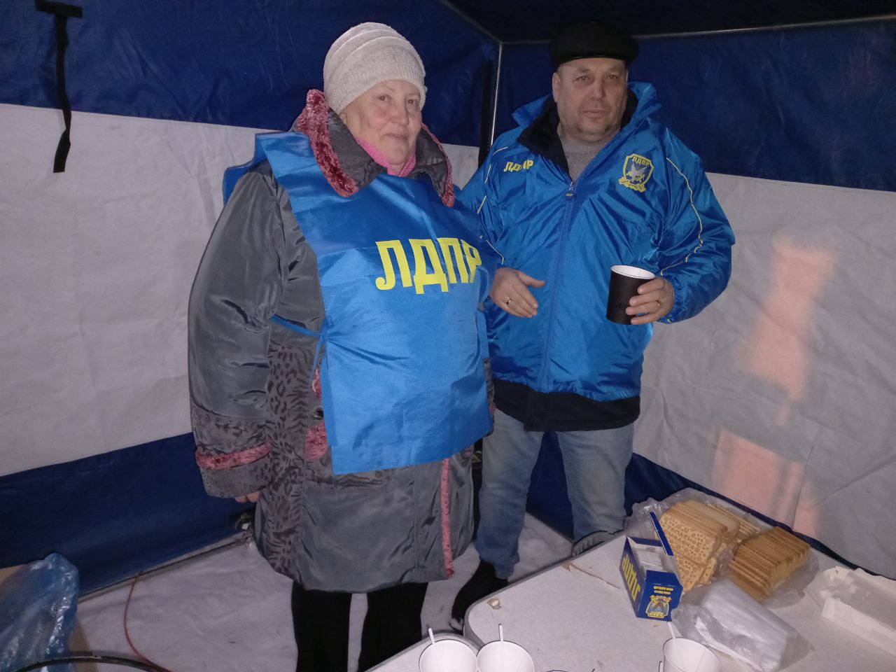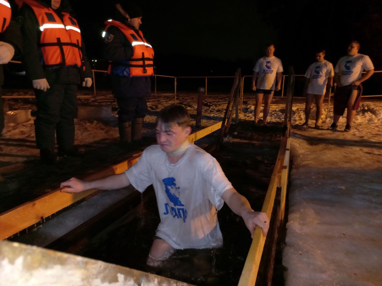 Традиционно партией были организованы палатки с бесплатным горячим чаем и сладостями, где все желающие могли согреться перед или после купания. На берегу собралось несколько сотен людей, но не каждый осмелился войти в ледяную воду. А многие активисты ЛДПР приняли участие в одном из главных обрядов праздника.