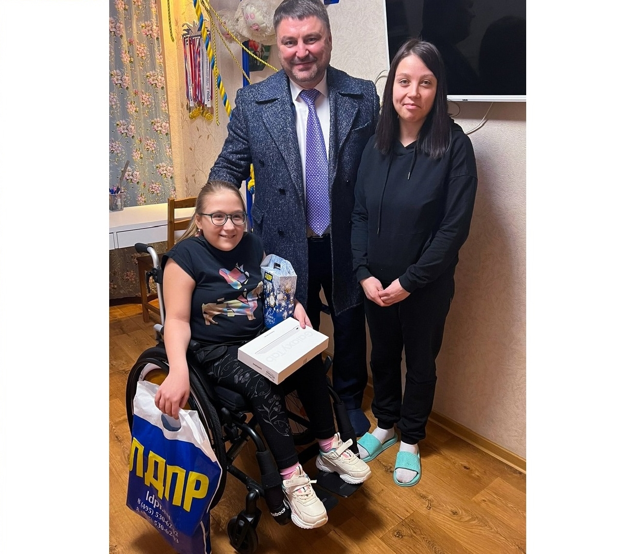 Сегодня Владислав Атмахов приехал к малышке в гости и преподнёс ей планшет Samsung и сладкое угощение от партии на память об этой встрече.