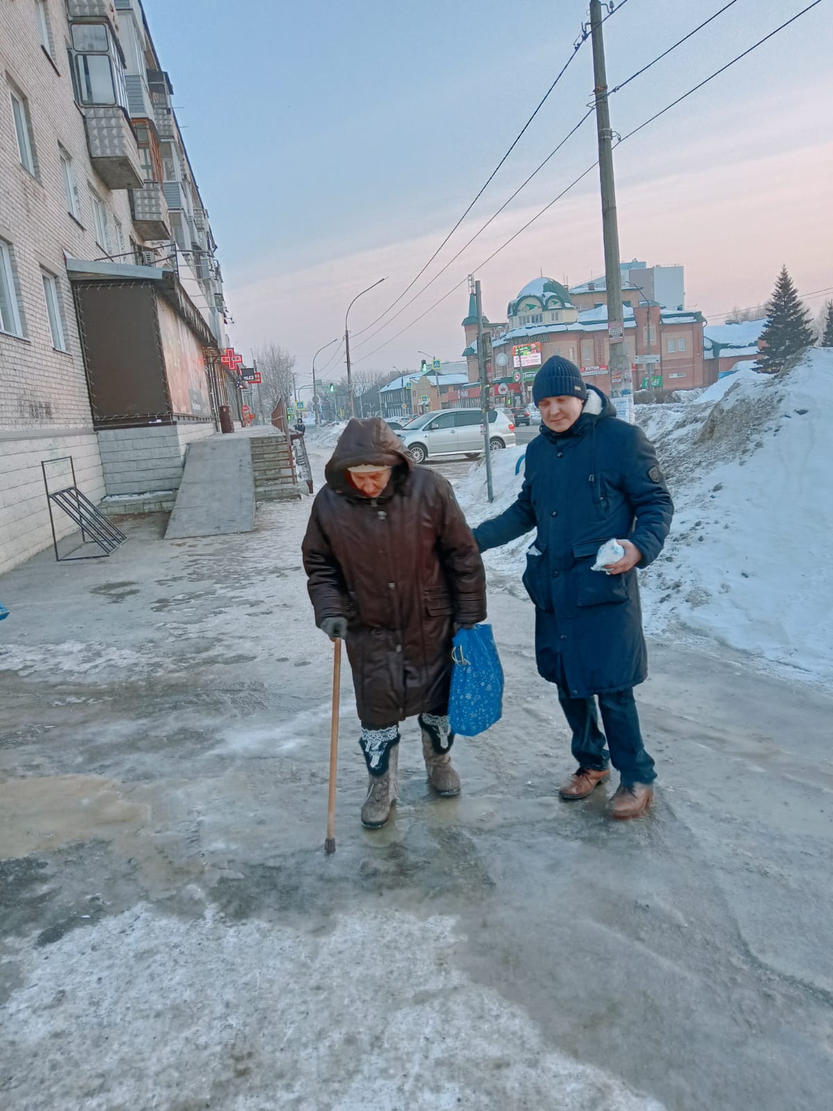 Координатор Новоалтайского отделения ЛДПР Никита Кравченко помогает жителям в борьбе с гололёдом на улицах города