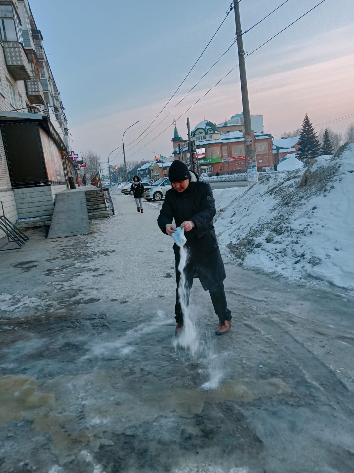К партийцу обратились горожане из-за образования дорожной наледи рядом с продуктовым магазином. Как выяснилось позже: работники магазина заняты ремонтными делами, из-за которых образовалась лужа, а впоследствии появился гололед. Проблема заключается еще в том, что в данном месте большой поток людей, и риск получить травму возрастает. Никита Кравченко незамедлительно отреагировал на проблему и засыпал лед солью, чтобы снизить риск происшествий.