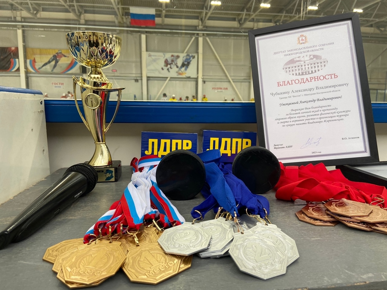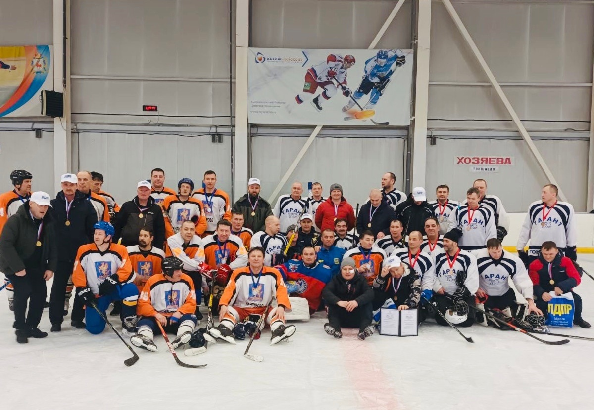 Турнир по хоккею состоялся в ФОКе «Атлант». На льду встретились команды из Шахуньи, Тоншаево и Костромской области! Спортсмены из клубов «Союз – ветеран», «Торнадо», «Старт-ветеран» и «Восток». Победители получили особенный приз – Кубок Владимира Жириновского и другие подарки от ЛДПР, всех участников наградили специальными медалями от партии.