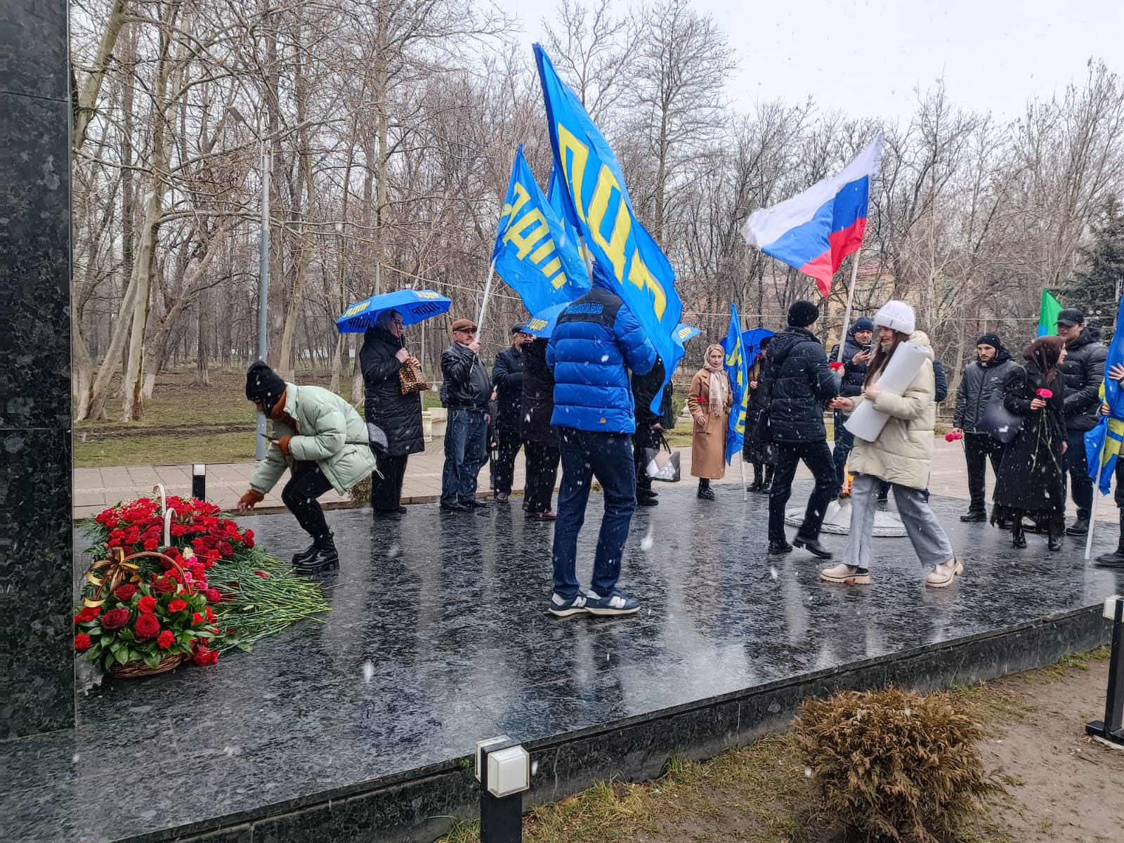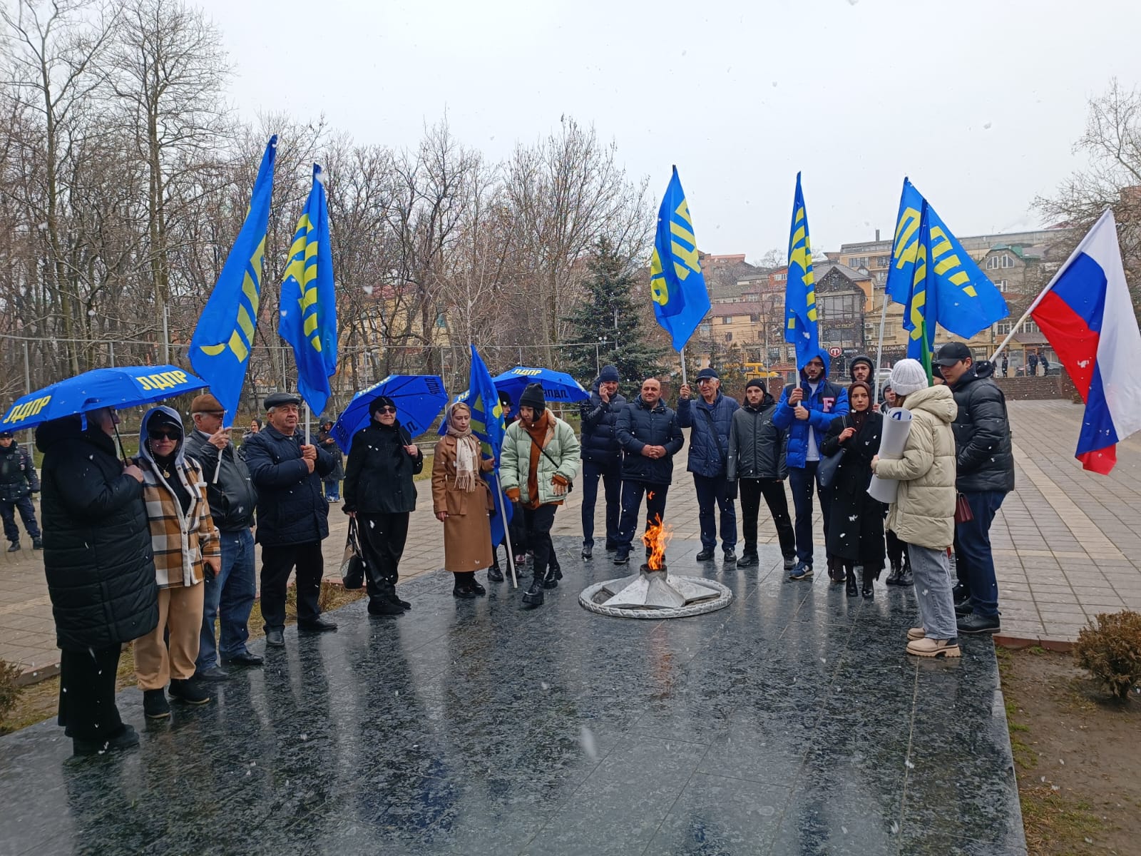 В День Защитника Отечества, 23 февраля, активисты ЛДПР под флагами Российской Федерации, Республики Дагестан и партийными флагами возложили венки у памятника Воину-освободителю в Парке Ленинского Комсомола