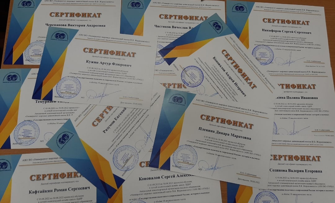 Активисты Молодежной организации ЛДПР получили долгожданные сертификаты об обучении в летней политической онлайн-школе ЛДПР от Университета мировых цивилизаций имени В.В.Жириновского по курсу: «Государственная политика в современной России: история и вызовы».