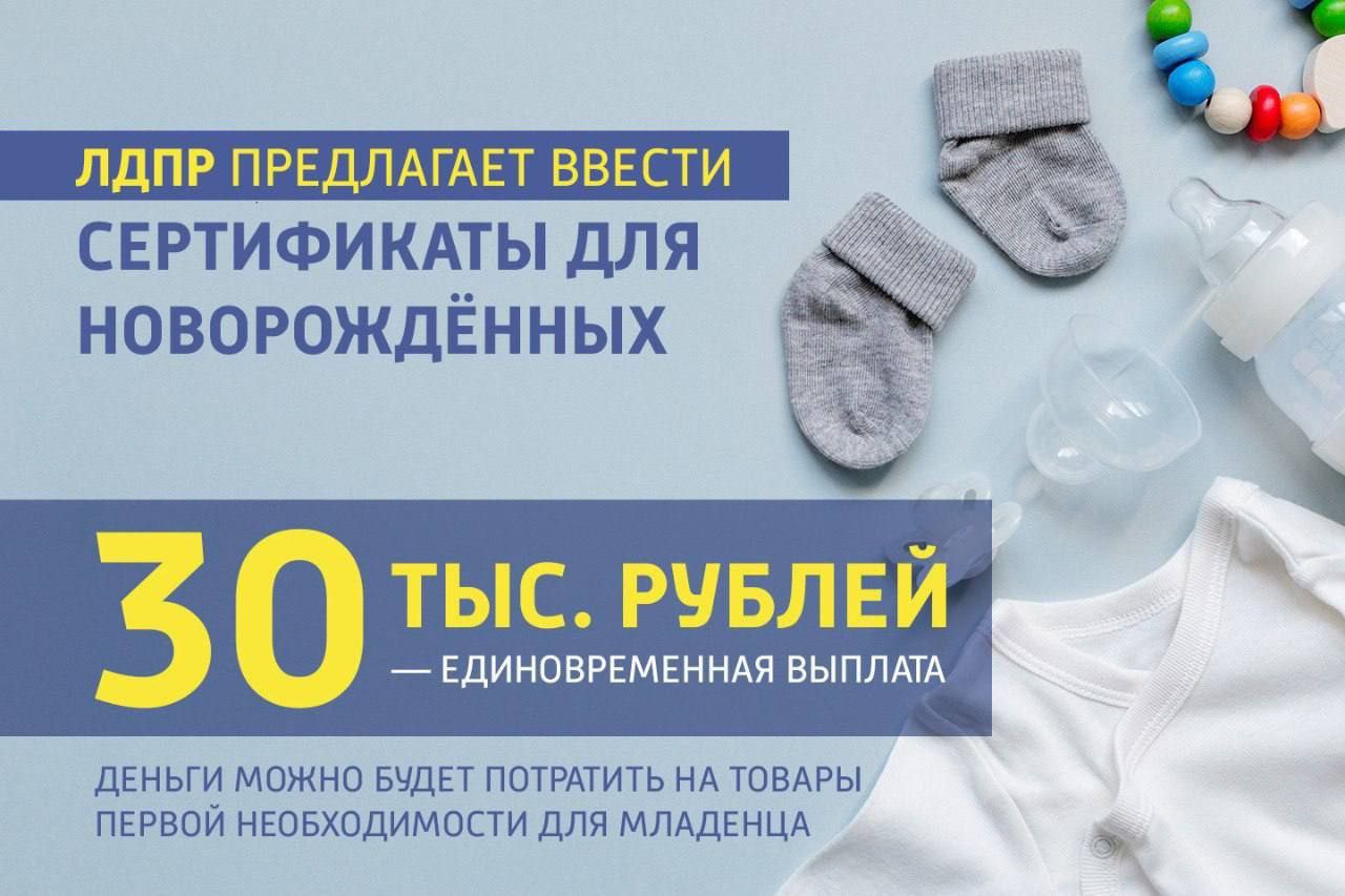 Сегодня с инициативой давать 30 тыс. рублей в качестве сертификата на новорождённого ребёнка выступила партия ЛДПР