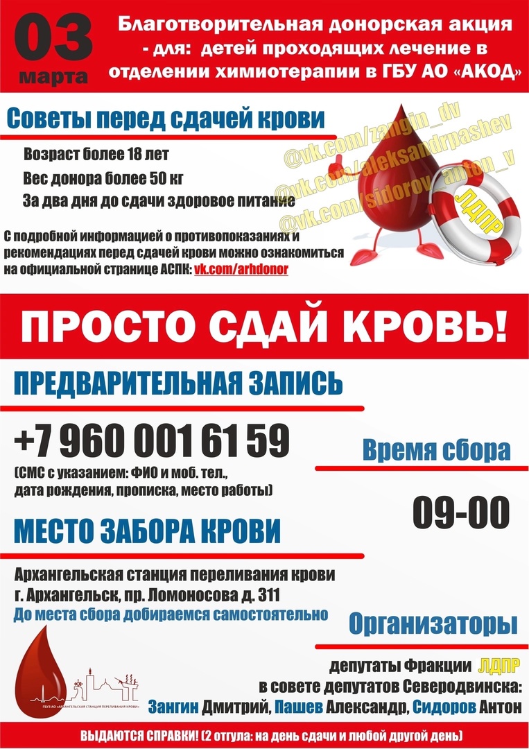 Время сбора на Архангельской станции переливания крови – 3 марта в 09.00. Обратите внимание, что необходима предварительная регистрация по номеру телефона 89600016159: смс с указанием ФИО, даты рождения, прописки и места работы.