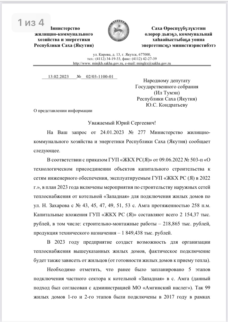 Заместитель координатора Якутского регионального отделения ЛДПР Артем Тюньков и народный депутат Ил Тумэн Юрий Кондратьев взяли под контроль вопрос с амгинцами, которым откладывают подключение к централизованному отоплению. На депутатский запрос министерство ЖКХ республики сообщило, что рассматривается вопрос по строительству новой механизированной котельной «Амга-3»
