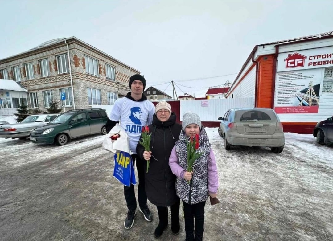 Координатор Упоровского отделения ЛДПР Сергей Шабалин совместно с активистами поздравил девушек, подарил цветы и партийные подарки