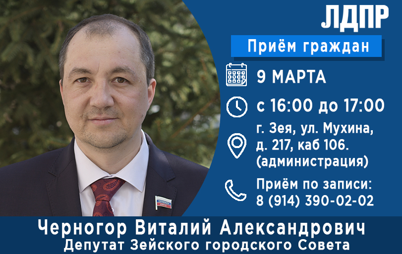 9 марта депутат фракции ЛДПР в Зейском городском Совете приём граждан в городе Зея