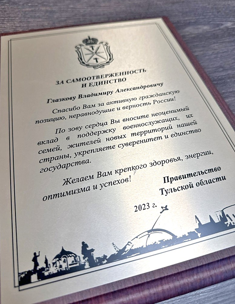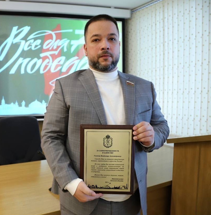 «По зову сердца Вы вносите неоценимый вклад в поддержку военнослужащих, их семей, жителей новых территорий нашей страны, укрепляете суверенитет и единство государства», — говорится в награде правительства Тульской области.