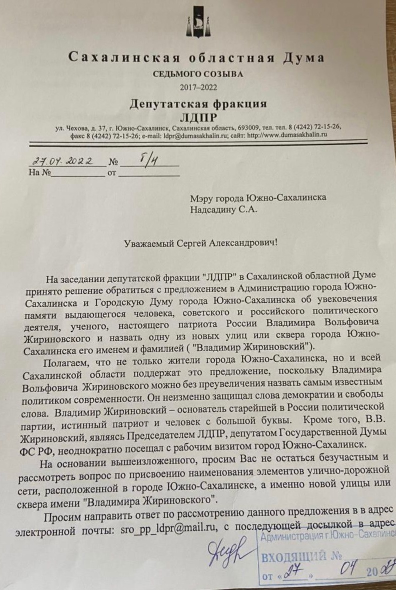 С инициативой назвать улицу в честь известного российского политика еще в апреле прошлого года обратились депутаты фракции ЛДПР в Сахалинской областной Думе Виталий Баранов и Дмитрий Флеер.