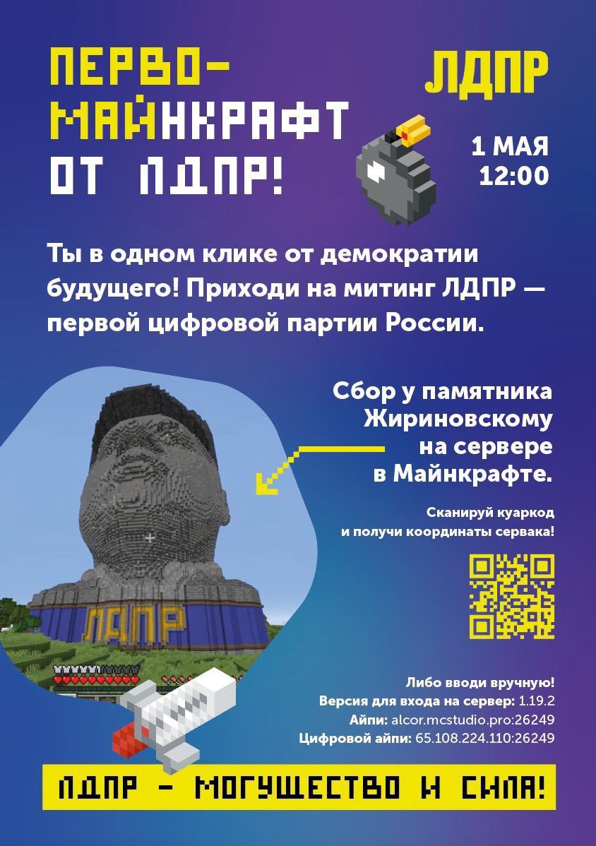 1 мая адыгейские партийцы решили провести демонстрацию в компьютерной игре Minecraft. Для онлайн-митинга выбрали сервер, на котором сторонники ЛДПР построили 200-метровый памятник ко дню рождения Основателя партии Владимира Жириновского.