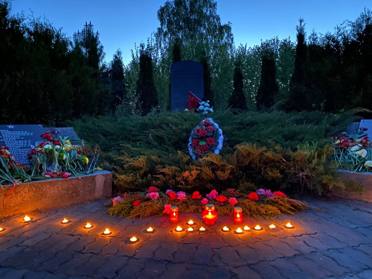 Местные жители у мемориала почтили память солдат Красной армии, павших в годы Великой Отечественной войны, и зажгли свечи.
