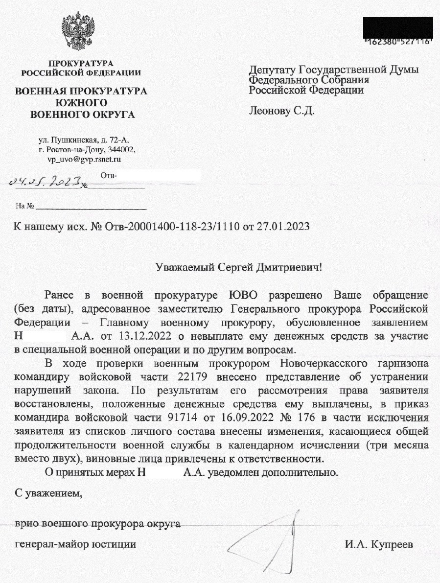 После обращения депутата Госдумы от ЛДПР Сергея Леонова в военную прокуратуру участник спецоперации получил денежное довольствие. К парламентарию обратился бывший военнослужащий по контракту Алексей Н.