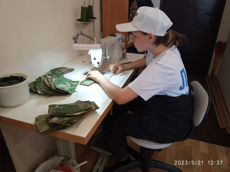 На этот раз ребята приняли участие в пошиве амуниции, выполняя задания опытных швей. Один из активистов шил детали карманов, двое других делали разметку на выкройках для рукавов.