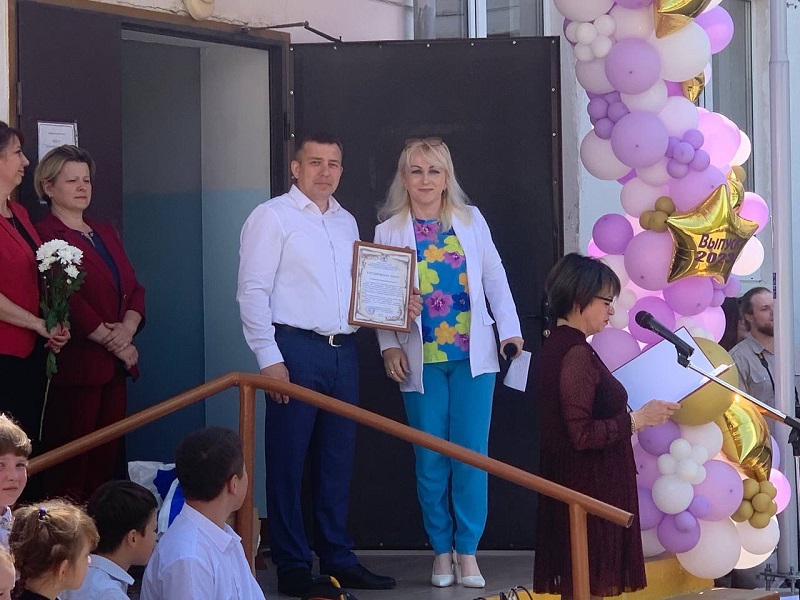 От Совета депутатов Полесского муниципального округа депутат вручила Благодарственные письма за патриотическое воспитание директору Евгению Афанасьеву и учителю истории Валентину Неверову.