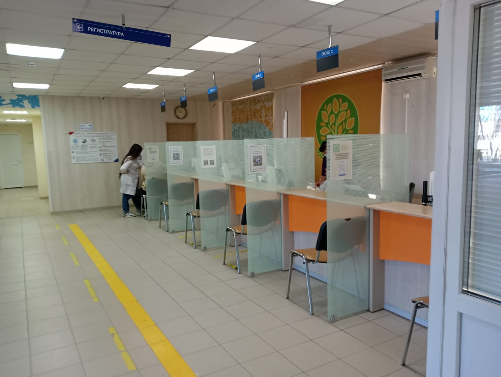 Сейчас специалисты регистратуры сами не записывают пациентов, это можно сделать самостоятельно через госуслуги, по телефону колл-центра или через терминал, находящийся в зале. По приложению «Госуслуги» записаться не удалось, так как были технические работы на сайте, но девушка из регистратуры помогла получить талон к терапевту, сама заполнив все поля. Заодно попробовали взять талон в женскую консультацию, к узкому специалисту ближайшая запись была только через 14 дней.
