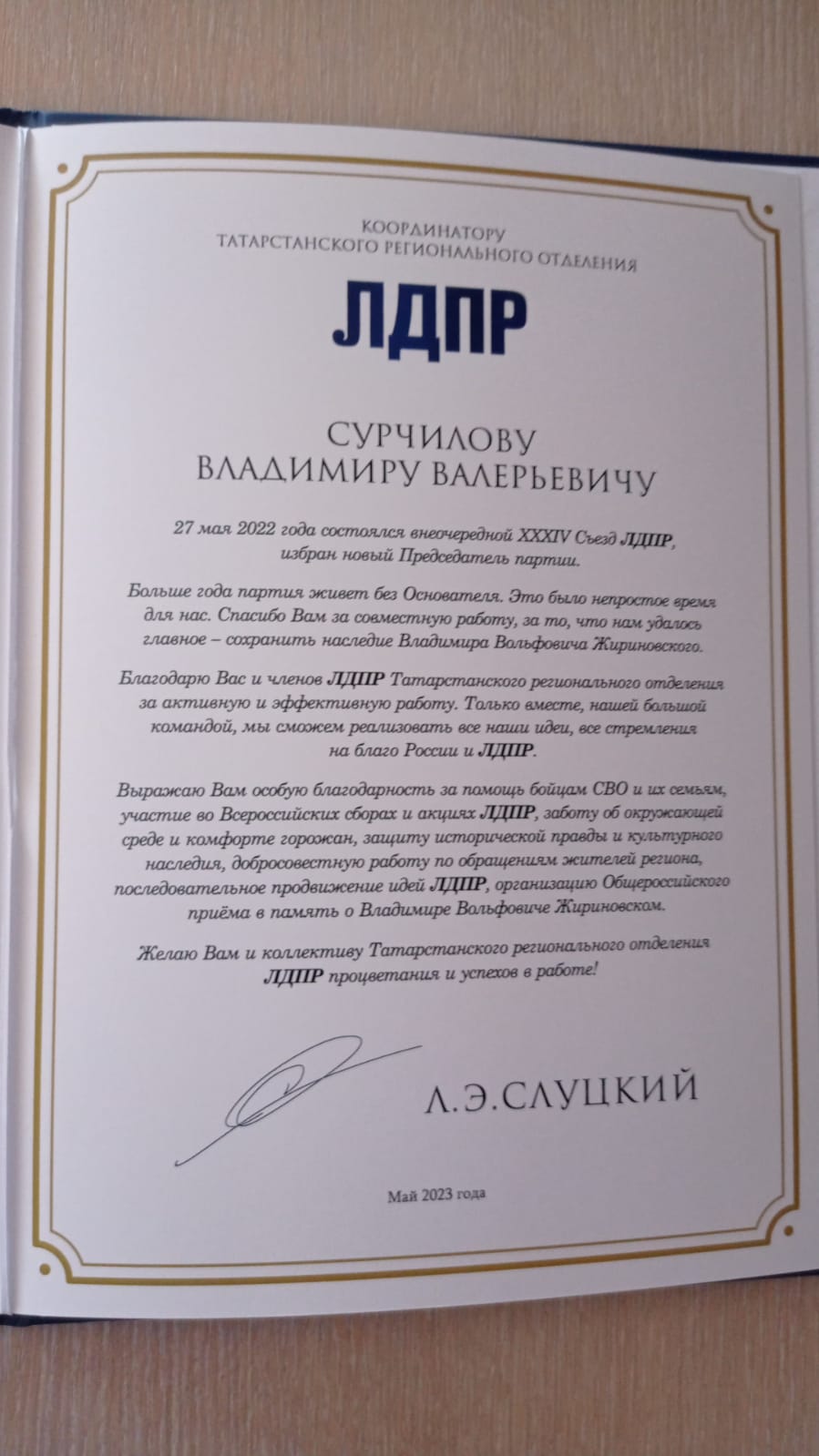 В завершении письма Председатель партии пожелал координатору Татарстанского регионального отделения ЛДПР Владимиру Сурчилову и его коллективу процветания и успехов в работе.