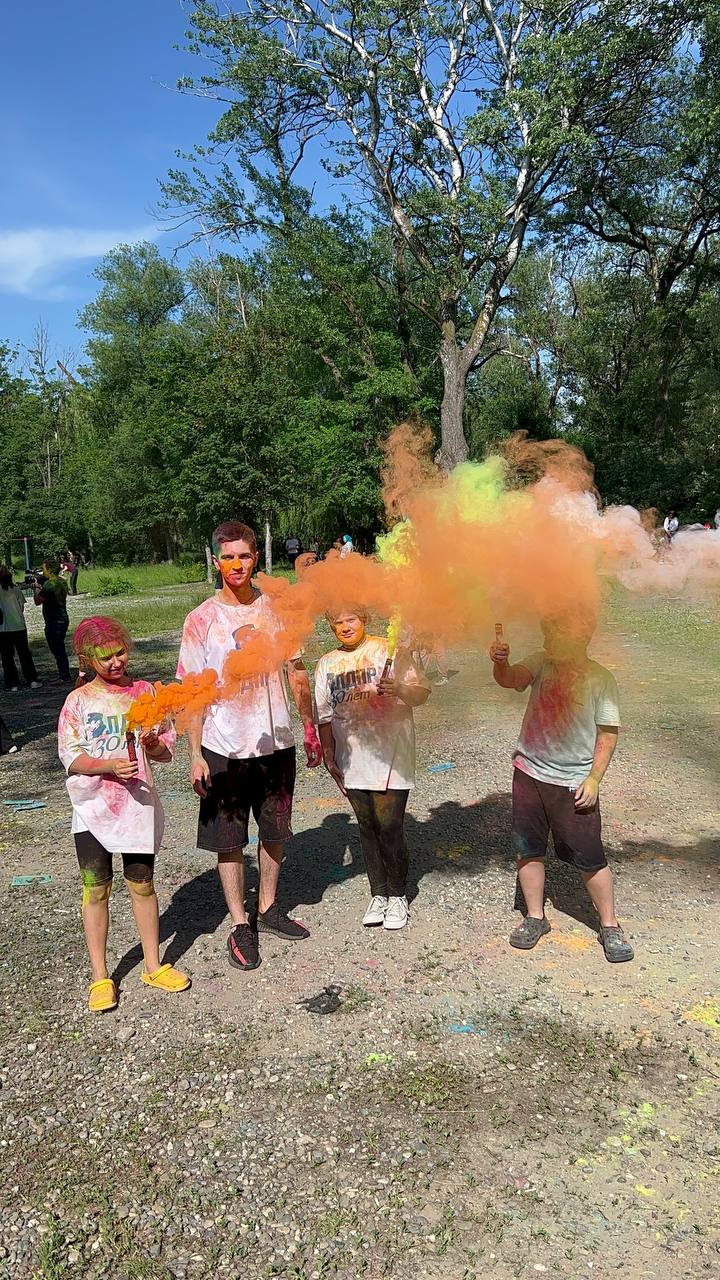 Под бодрую музыку в воздух взвились разноцветные клубы краски. Краска здесь особая- порошковая и абсолютно безвредная для здоровья. За считанные минуты она окрашивает кожу, одежду, обувь и волосы. В потом так же легко и просто смывается обычной водой.