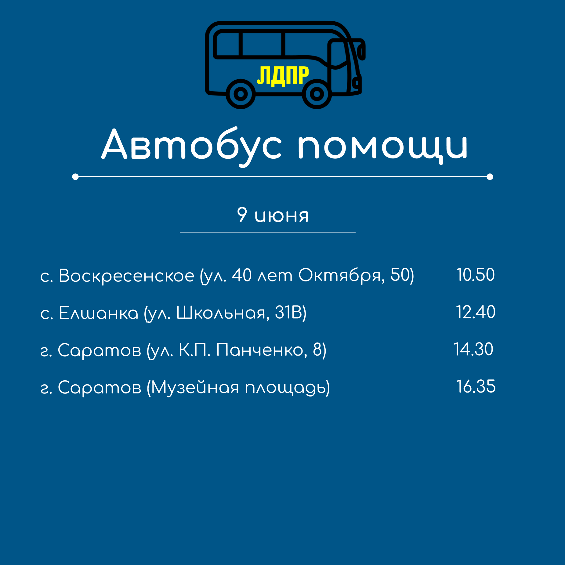 Предлагаем вам ознакомиться с обновленным маршрутом работы мобильной приемной с 7 по 9 июня. Депутаты, сотрудники реготедления, координаторы и активисты приедут в указанные районы чтобы собрать обращения, пообщаться с жителями и вручить памятные подарки от ЛДПР. Обращение по волнующей вас проблеме можно написать заранее или на встрече с нами.