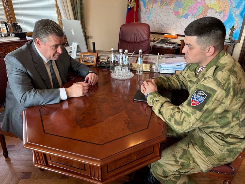 Председатель ЛДПР Леонид Слуцкий встретился с партийцем Максимом Крайном, который сейчас исполняет обязанности командира взвода разведроты. Мужчина ушел на фронт с начала мобилизации и с января этого года находится на линии сопротивления