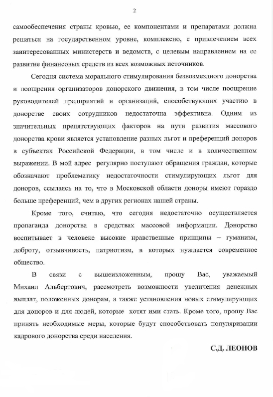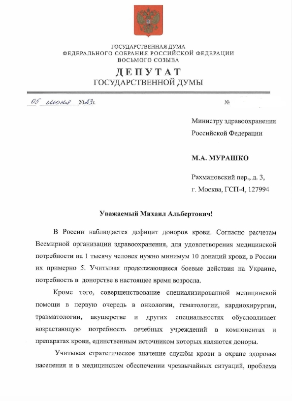 Согласно расчетам Всемирной организации здравоохранения, чтобы удовлетворить потребности в крови на 1 тысячу человек, нужно минимум 10 донаций. В нашей стране их примерно 5. Поэтому у нас дефицит крови. В тоже время сегодня потребность в ней возросла. Депутат фракции ЛДПР Сергей Леонов направил обращение главе Минздрава РФ Мурашко с предложением усилить мотивацию доноров, как это практикуют в Москве