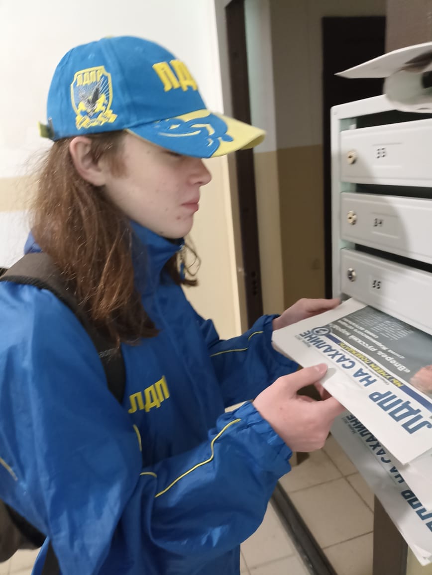 Активисты молодежной организации ЛДПР энергично распространяют партийную газету на Сахалине