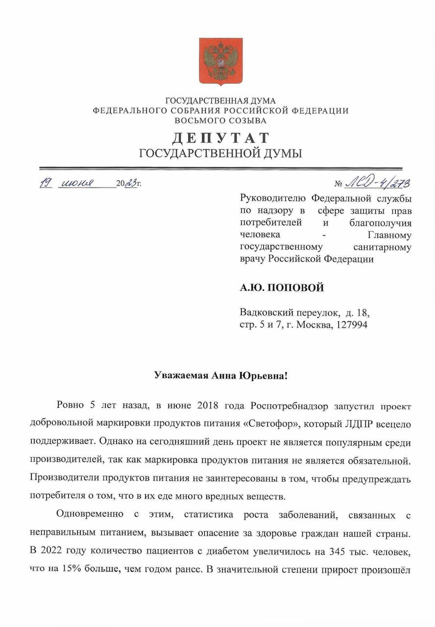 В 2018 году Роспотребнадзор запустил проект добровольной маркировки продуктов «Светофор». Красным цветом выделяется переизбыток соли, сахара, жира и трансжиров, а их нормальные значения — зелёным. Это прекрасная акция, которую ЛДПР всецело поддерживает. Однако в добровольном формате она оказалась неэффективна: производителям невыгодно предупреждать о большом количестве вредных веществ в их продукции.