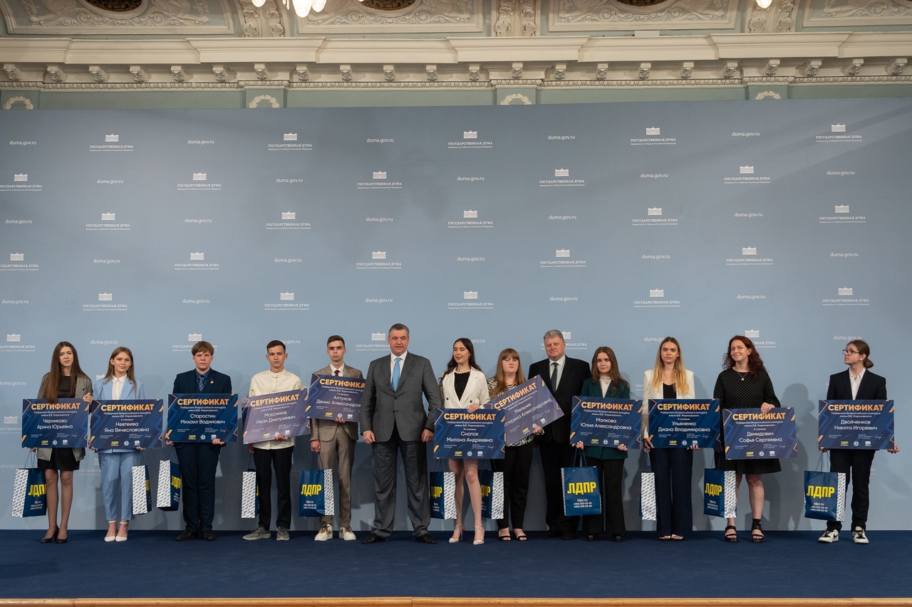 Леонид Слуцкий, лидер ЛДПР, вручил именные сертификаты победителям Всероссийского конкурса имени В.В. Жириновского. 6 абитуриентов из разных субъектов России будут бесплатно учиться в Университете мировых цивилизаций имени В.В. Жириновского.
