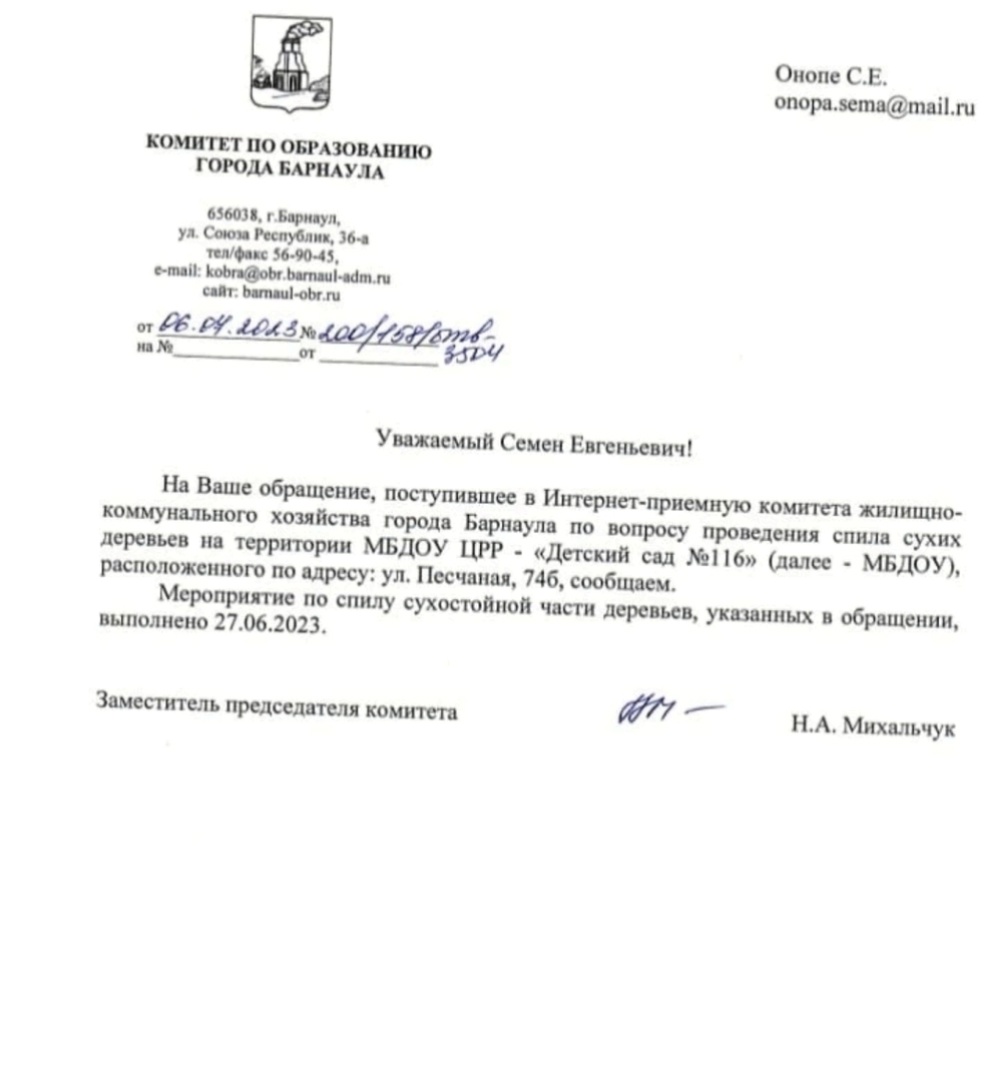 На территории детского сада № 116 в г. Барнауле находились сухостойные деревья, которые создавали аварийную ситуацию. Координатор Барнаульского первичного отделения ЛДПР Семён Онопа составил обращение в администрацию города о необходимости проведения санитарной обрезки сухостойной части деревьев.