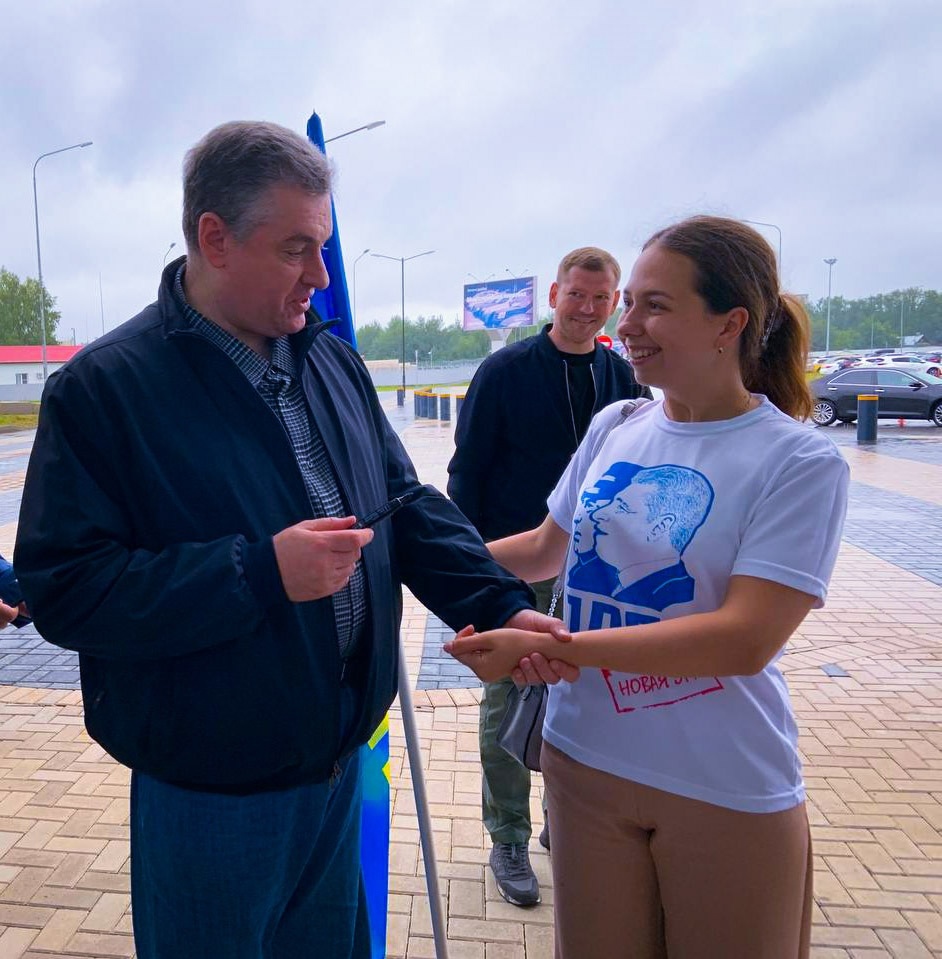 Предыстория: активисты ЛДПР из Дзержинска создали уникальную атрибутику к году с момента избрания Леонида Слуцкого Председателем ЛДПР (27 мая). На встрече в аэропорту Лидер обратил внимание на футболку с его изображением и оставил автограф на плече Алёны, а представитель партии Александр Гущин исполнил Леониду Эдуардовичу гимн ЛДПР.