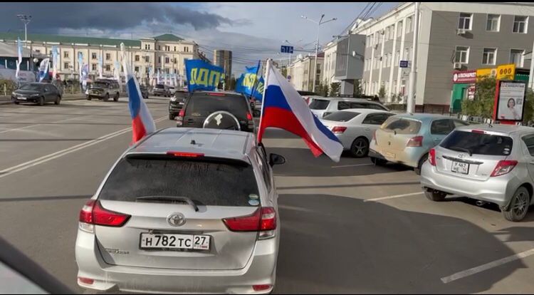Несмотря на град, дождь и сильный ветер, партийцы организовали автопробег в Якутске со штаба якутского регионального отделения до района аэропорта.