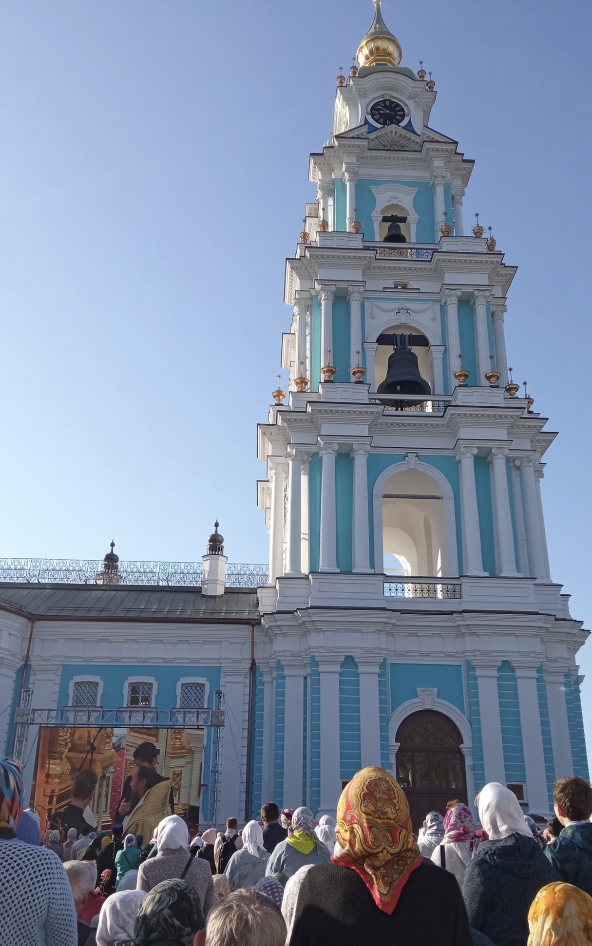 Гости смогли воочию убедиться, что воссоздана полная копия утраченного в советские годы храма. Святыню отстроили заново по проекту архитектора восемнадцатого века Степана Воротилова. Единственная дань времени – обустройство специальных лифтов, благодаря которым на смотровую площадку смогут попасть люди разных возрастов и с особенностями здоровья. Так как всех желающих увидеть церемонию было слишком много, на площадке рядом с кремлем вели прямую трансляцию.