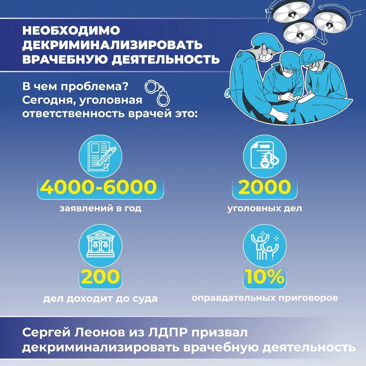 Депутат предложил внести изменения в статьи УК РФ, из-за которых, по его данным, медики несправедливо получают сроки за врачебные ошибки. Кроме этого, Сергей Леонов предложил учредить должность уполномоченного по правам медработников для защиты прав попавших под уголовное преследование.